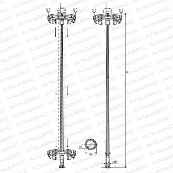 Высокомачтовые опоры освещения, предназначенные для монтажа большого количества светильников (до 12) на высоте, позволяющей увеличить их продуктивность и площадь охвата. Опоры ВМО-30-В исп. 5 заменяют собой сразу несколько стандартных опор освещения, что позволяет полностью окупить их увеличенную стоимость, связанную не только с большой металлоемкостью, но и со сложной организацией конструкций. При этом такие металлоконструкции отличаются оптимальным для своих габаритов весом, не создают излишней нагрузки на грунт, могут быть использованы для подземного подвода кабельной системы, что позволяет отказаться от протягивания дополнительных проводов. Системы используются на стадионах, на промышленных площадках и т.д. Их гармоничный дизайн и современное исполнение, а также возможность обслуживания без привлечения габаритной спецтехники, которой часто требуется специальный подъезд, позволяют использовать их при обустройстве жилых комплексов.
